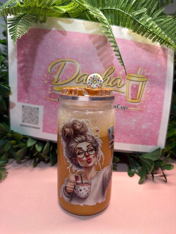 El vaso perfecto para las amantes del café y de los momentos “soy yo, mi bebida y mi paz”. Este diseño combina tonos cálidos tipo café latte con una ilustración de chica relajada disfrutando su tacita, ideal para acompañarte en tus mañanas, tardes de trabajo o maratones de series.