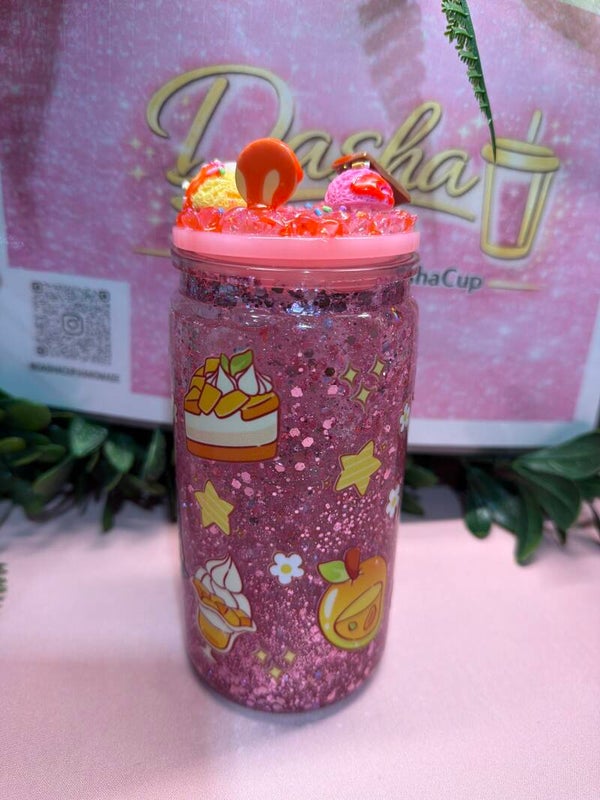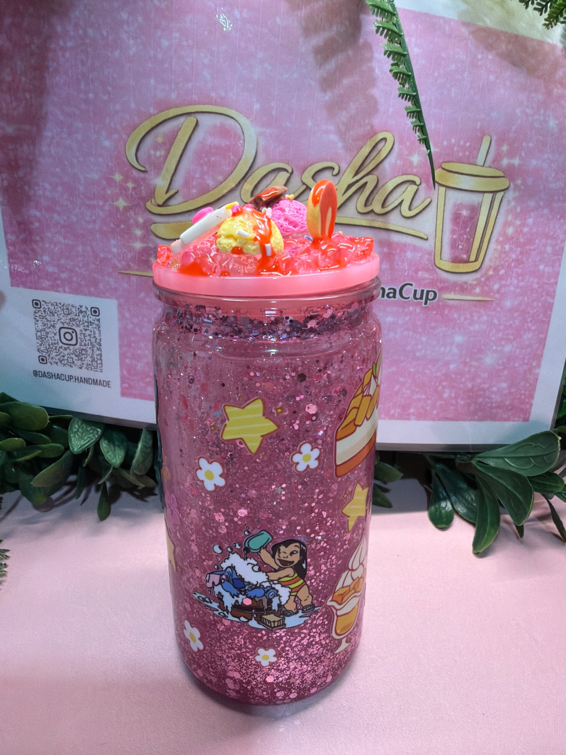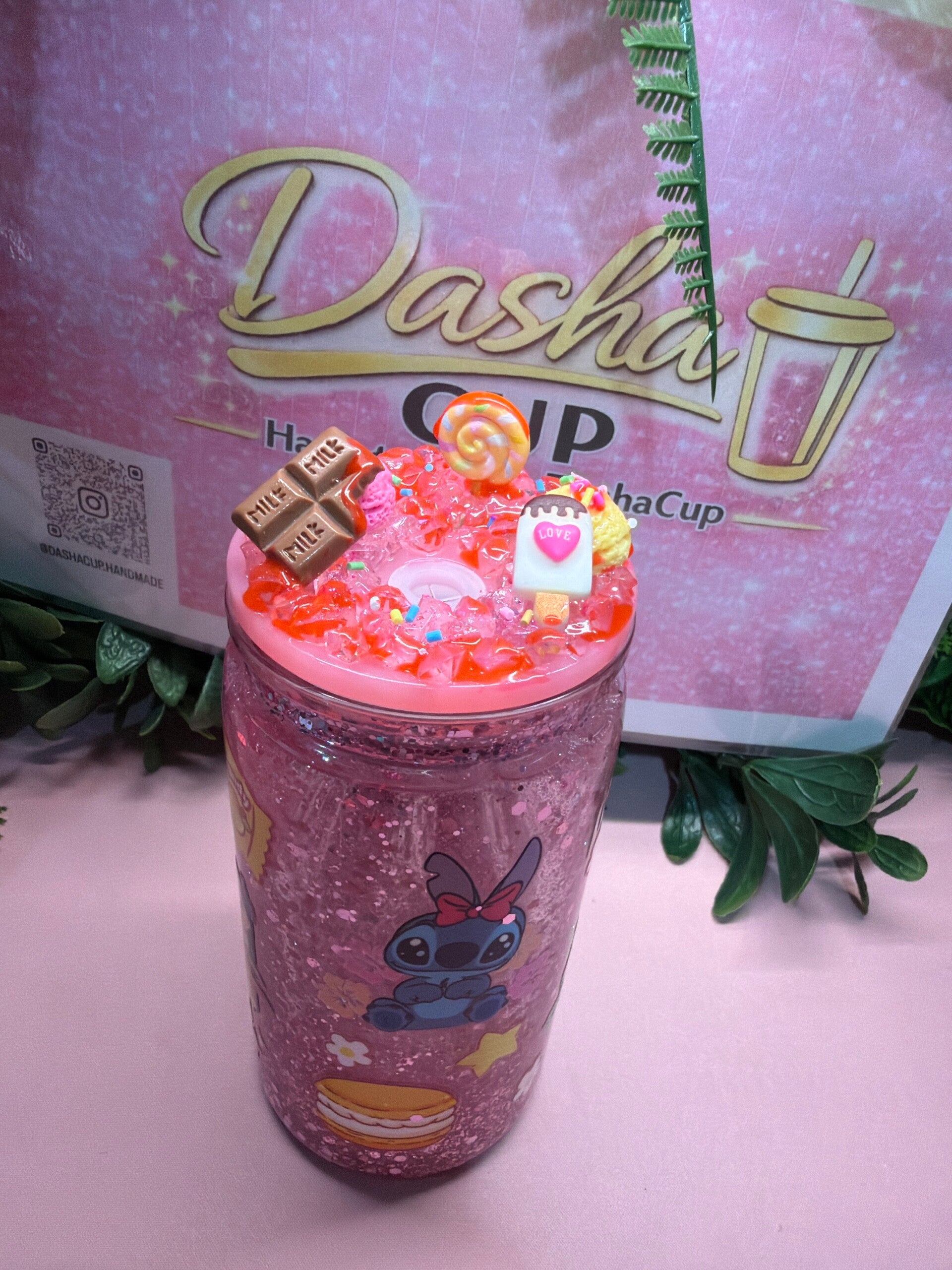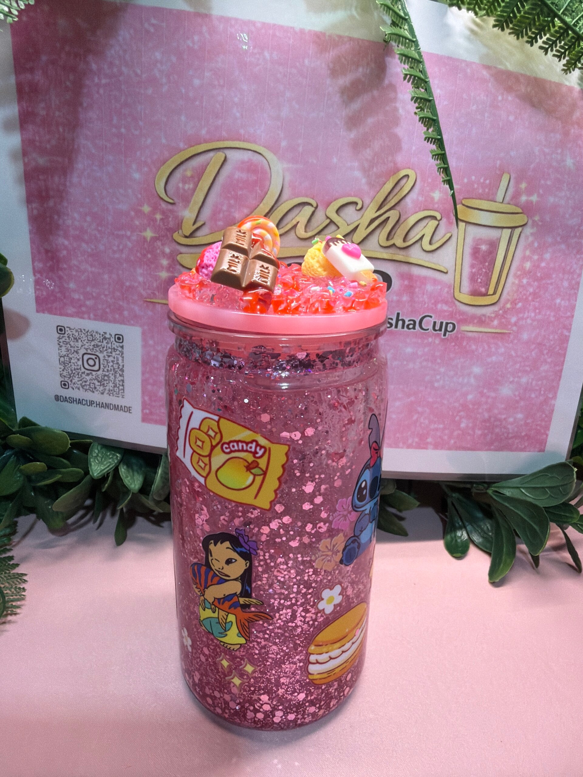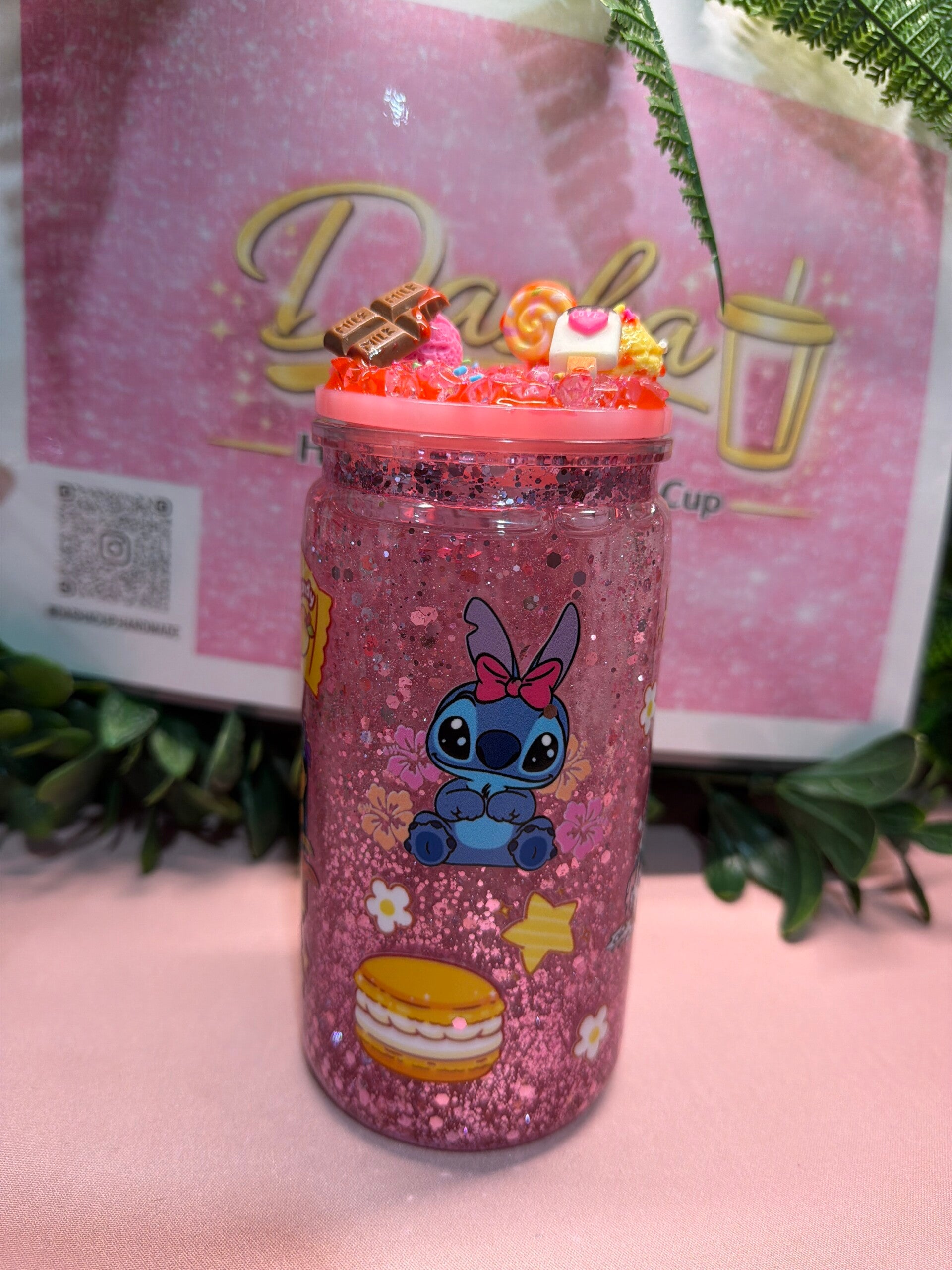 Vaso artesanal con acabado glitter rosa y diseño de Stitch en versión adorable, rodeado de postres y detalles dulces. Tapa decorada con charms de chocolatito y toppings que le dan un look súper kawaii. Perfecto para amantes de lo tierno y brillante.