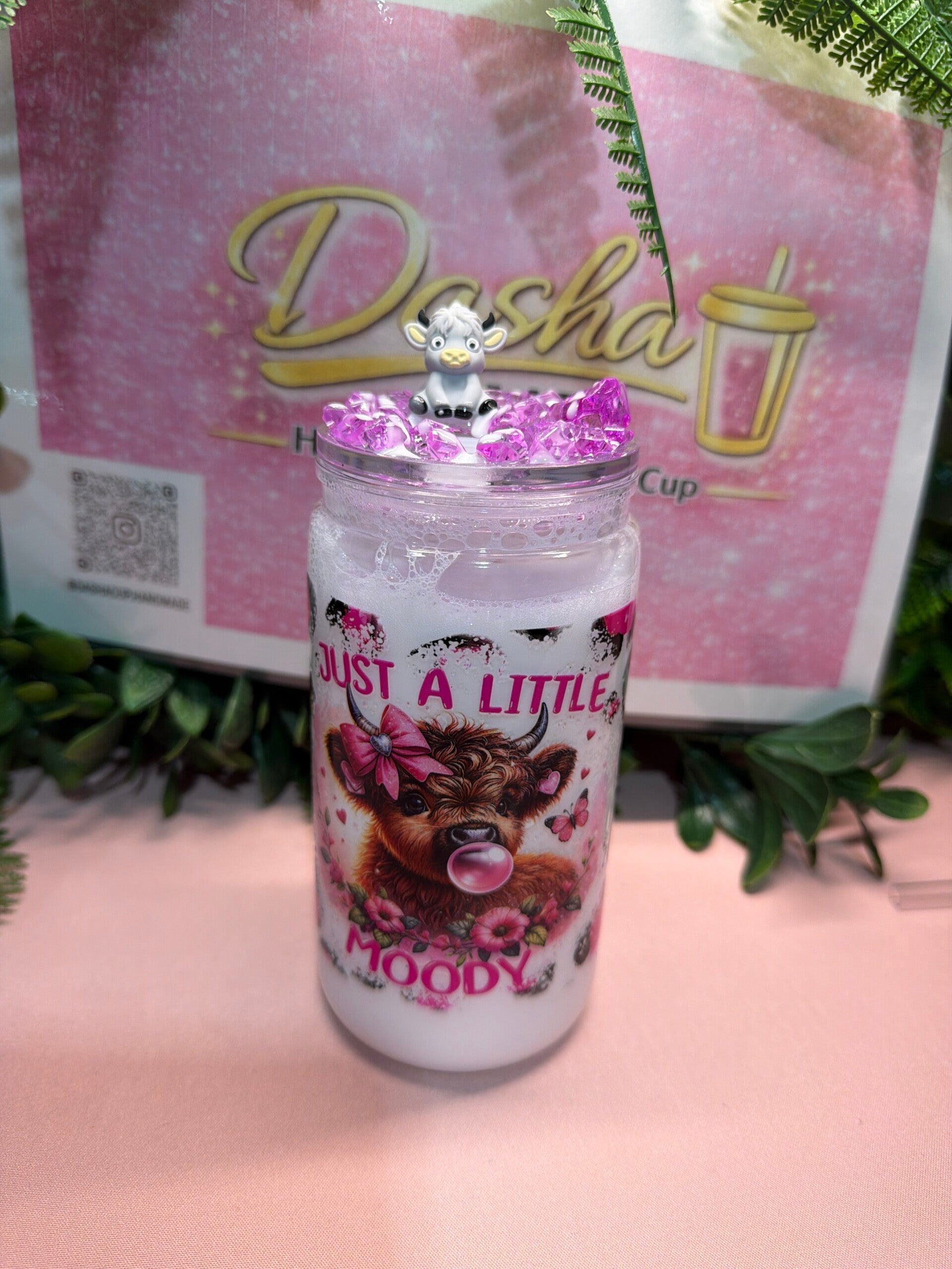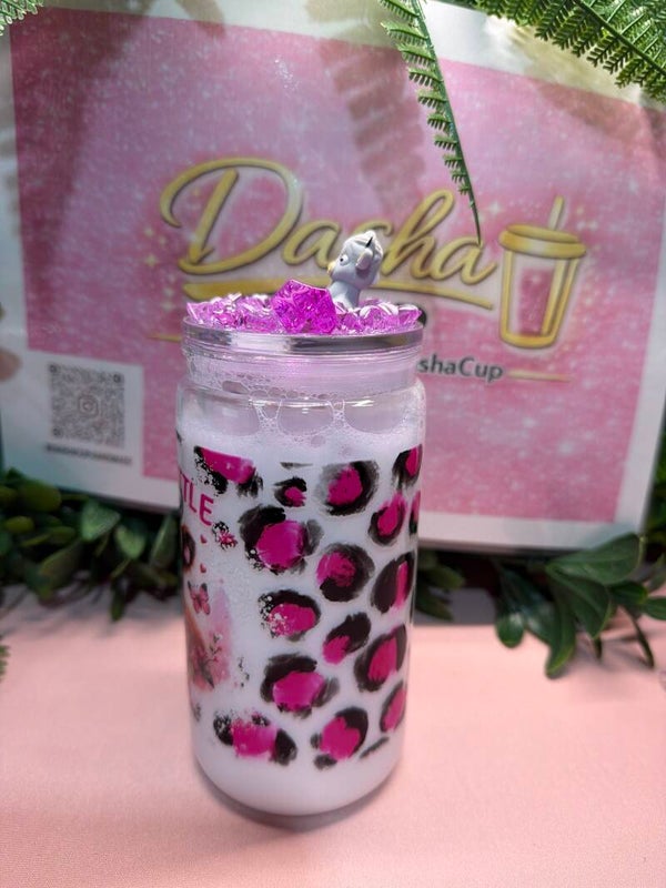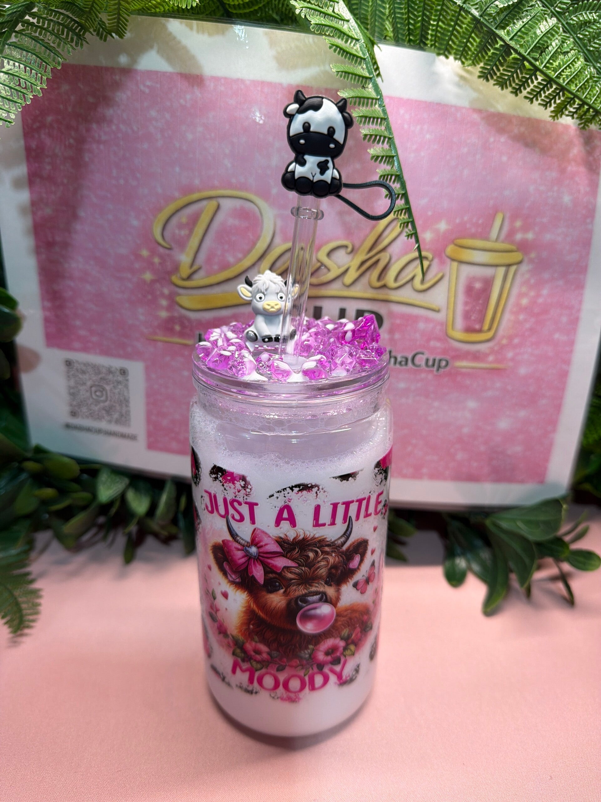 Vaso blanco con vaquita coqueta soplando burbuja y mensaje divertido. Detalles en tonos rosas y lilas, con topper animalito a juego. Perfecto para esos días de humor cambiante pero con estilo.
